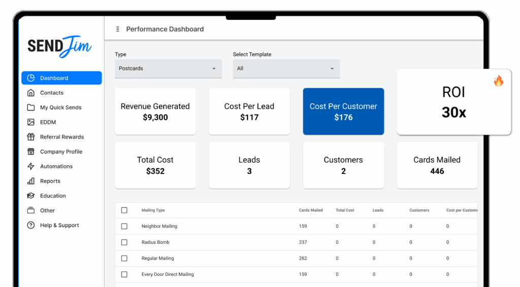 Yolanda C.Trustindex verifies that the original source of the review is Capterra. [sensitive content hidden] with SendJim Overall: Every time I request help they are ready. Pros: They are ready to help, answer questions, guide you! Cons: Nothing. They are always eager to help. . Craig H.Trustindex verifies that the original source of the review is Capterra. Get product great price Pros: I think being able to focus on neighborhoods rather than all out USPS direct mail Cons: I like everything about Send Jim not a negative thing about it. Sarita G.Trustindex verifies that the original source of the review is Capterra. Sendjim Review Overall: Really great. The team are fast and Efficient - Shout out to [sensitive content hidden] Pros: The support team are fast efficient and proactive. Cons: The flashing training button on the knowledge base blows my mind. Your training videos need the option to pause go back or forward. Stephanie S.Trustindex verifies that the original source of the review is Capterra. Easy to use Overall: Great! Very easy to use and the staff is wonderful with any technical support issues Pros: Easy to set up and utilize. We love the gift options for clients and it linking with our dispatch account for when new leads come in, seeing when a job is complete to then automatically send out mailers to potential clients in the area we recently serviced Cons: I wish that they had an option for e-gift cards for their gifts Rosemary H.Trustindex verifies that the original source of the review is Capterra. Highly recommend Sendjim for small business owners Pros: The ease of getting set up. You can start with a cheaper monthly fee until you realize what you all want to do/need with the program. Easy to get items uploaded and also upload customer list. The integration is amazing for the price. Cons: I don't have much I don't like about it. Maybe the reporting could be a little more depth. Brandi M.Trustindex verifies that the original source of the review is Capterra. SendJim makes my life easier Pros: 3rd Party Integration, drawing areas to target for direct mail campaigns, demographic information, and varied offers for customer rewards Cons: Cost, it's a bit higher than most without more benefits Michael C.Trustindex verifies that the original source of the review is Capterra. Michaels Very Own Review Pros: SA integration is good, automates neighbors mailing in a way that nothing else can Cons: I do not like the radius bomb for commercial addresses.
