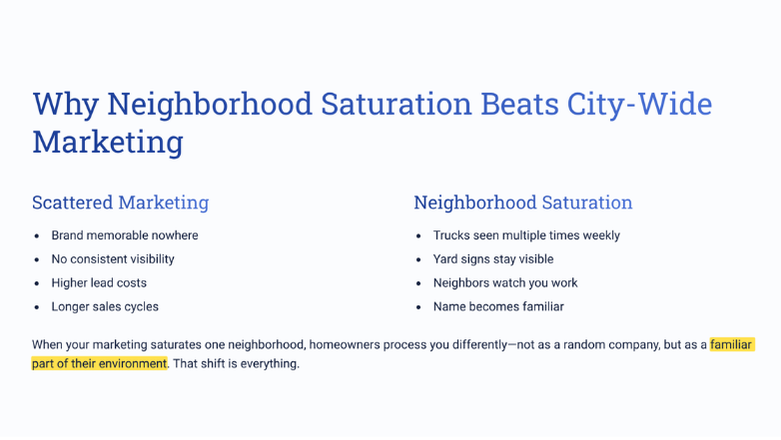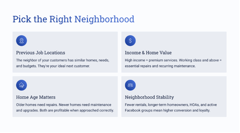 • Pick the right neighborhoods. Focus on areas where you’ve already done work, with stable homeowners, matching job types, and active communities (Facebook groups, HOAs, Nextdoor). These are the pockets where your marketing compounds the fastest.