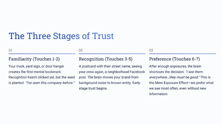This is why the neighbor who saw your truck twice, got two postcards, and saw a few people on Nextdoor saying good things…chooses you before they even compare quotes.